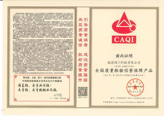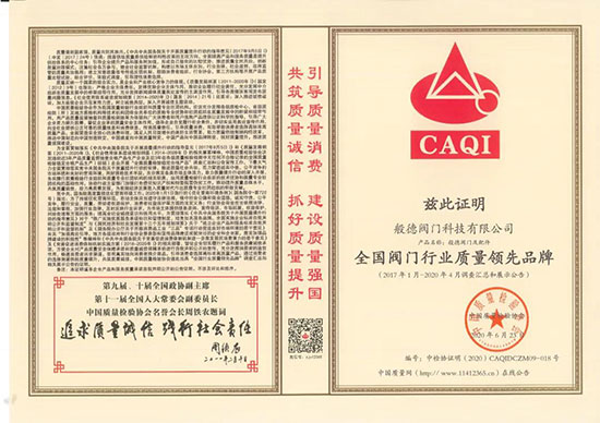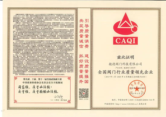 般德閥門(mén)榮獲CAQI“全國(guó)閥門(mén)行業(yè)質(zhì)量領(lǐng)先品牌”、“全國(guó)閥門(mén)行業(yè)質(zhì)量領(lǐng)先企業(yè)”、“全國(guó)質(zhì)量檢驗(yàn)信譽(yù)保障產(chǎn)品”。