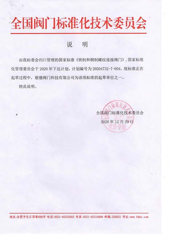 圖|般德閥門(mén)是《鐵制和銅制螺紋連接閥門(mén)》標(biāo)準(zhǔn)的起草單位之一