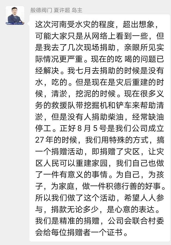 般德閥門27歲生日,我們決定一起做一件有意義的事!般德閥門總經(jīng)理夏許超帶頭發(fā)起“抗洪救災(zāi)愛心捐款”活動,捐款全部購買老鄉(xiāng)們急需的物資,助力災(zāi)后重建。
