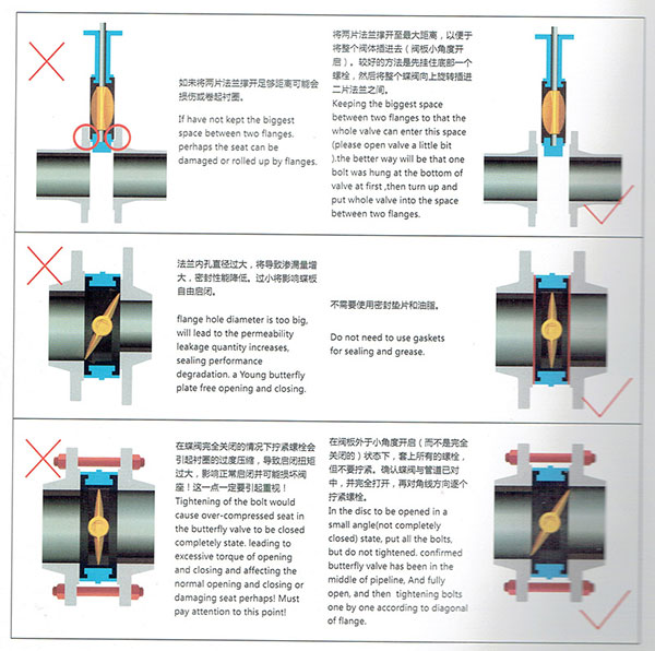 3、在蝶閥完全關(guān)閉的情況下擰緊螺栓會(huì)引起襯圈的過度壓縮,導(dǎo)致啟閉扭矩過大,影響正常啟閉并可能損壞閥座!