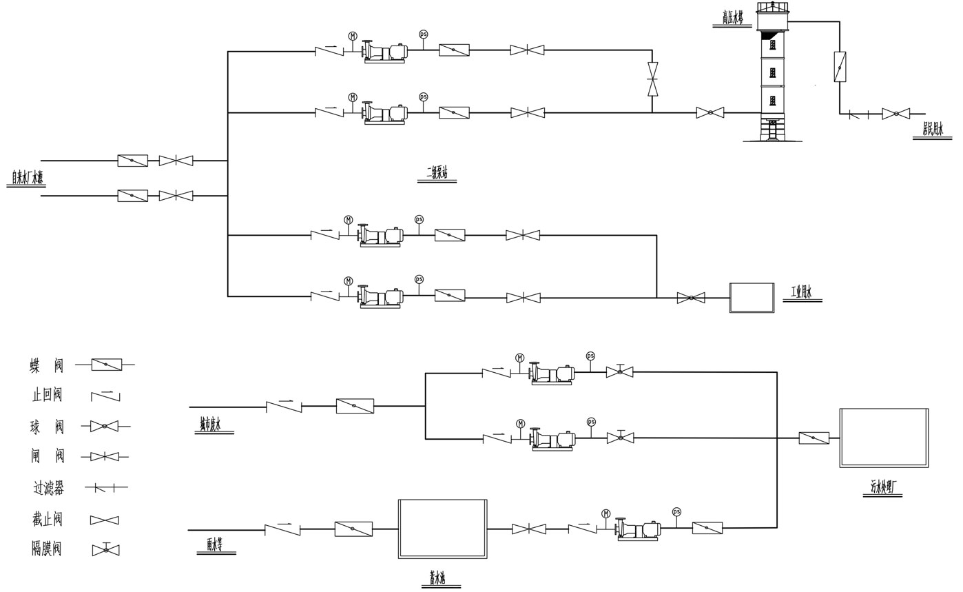供水系統(tǒng):保證城市工況企業(yè)及居民生活用水輸配,將經(jīng)過給水處理后的水送到各個給水區(qū)域的全部管網(wǎng),同一泵站內(nèi)的不同水泵分別供水到水壓要求高的高壓管網(wǎng)和水壓要求低的低壓管網(wǎng)。