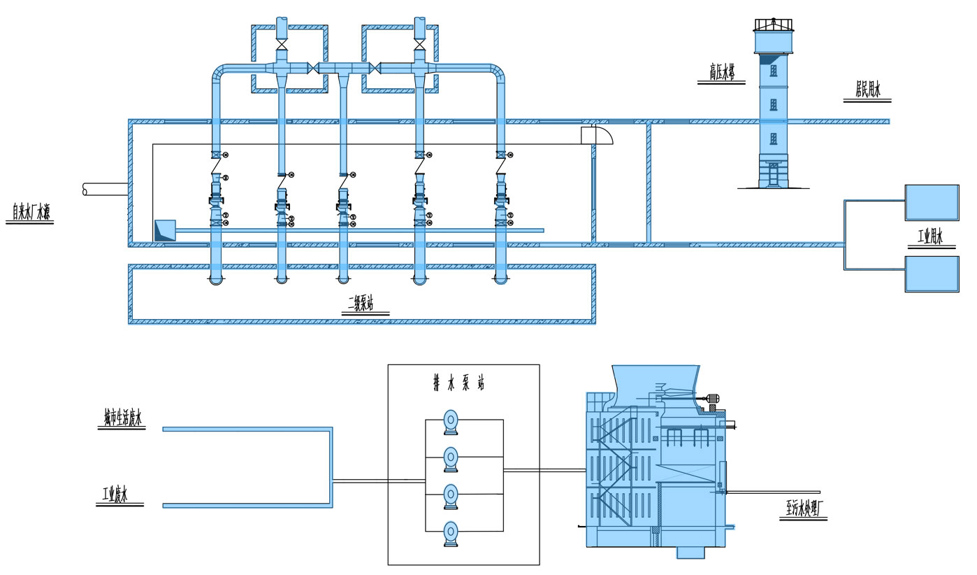 將從自來水廠處理過的清水,輸引配送到用水區(qū),供用戶使用,主要由二級泵站、輸水管道、配水管網(wǎng)、水塔等幾部分構(gòu)成。